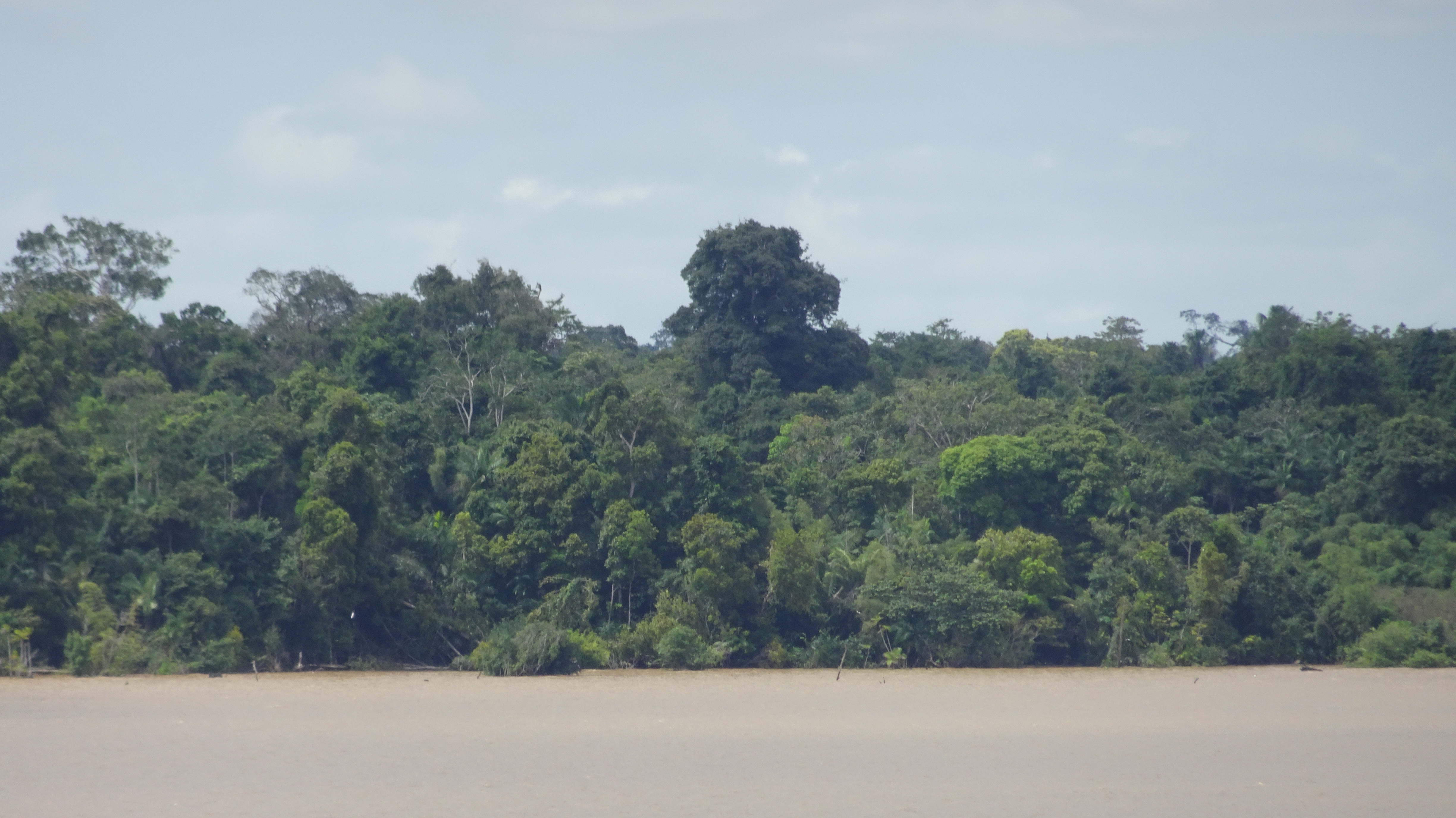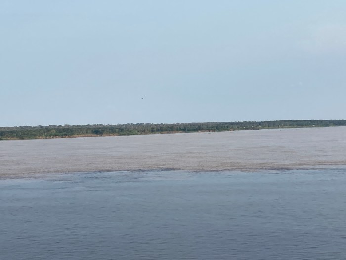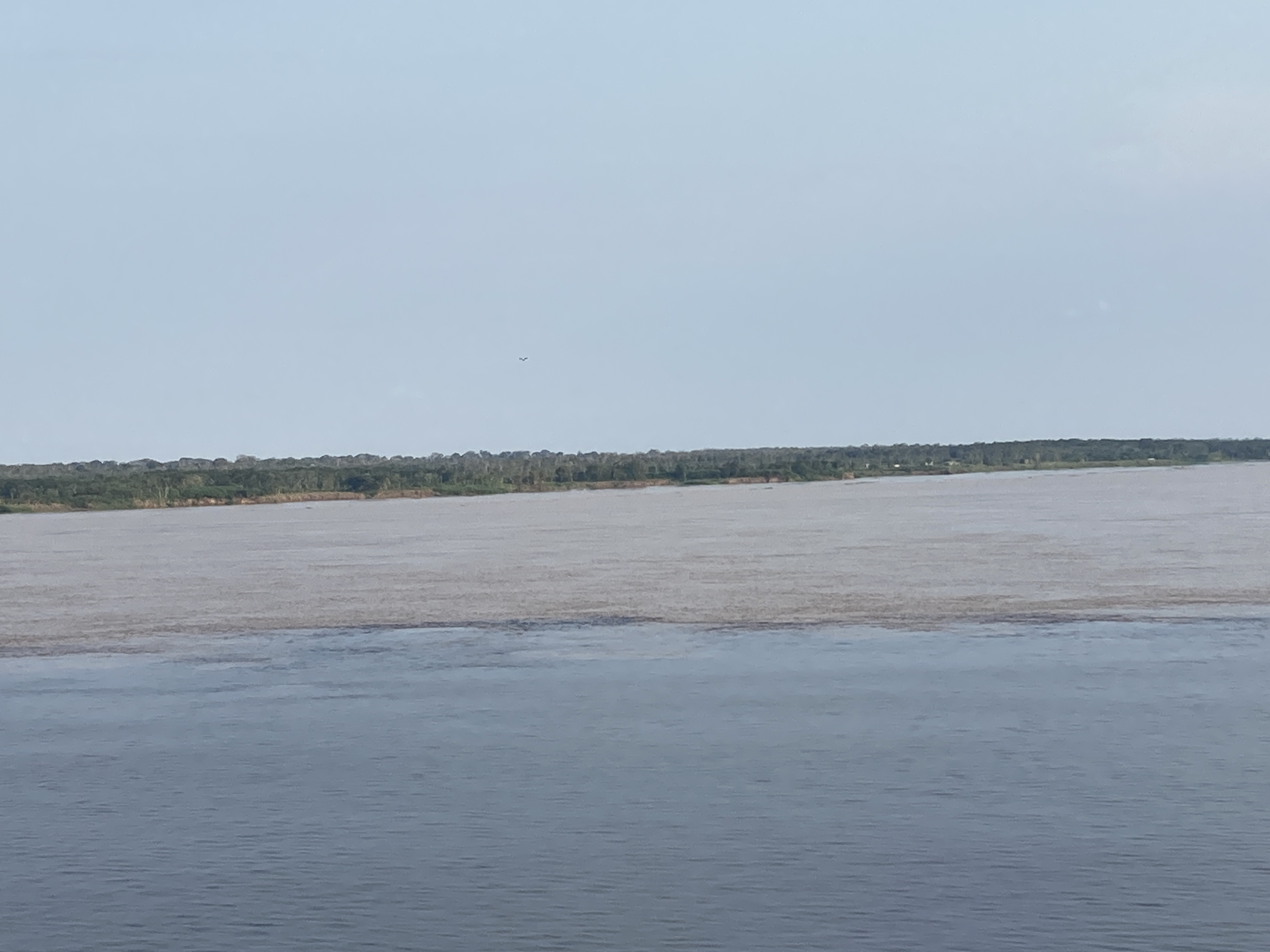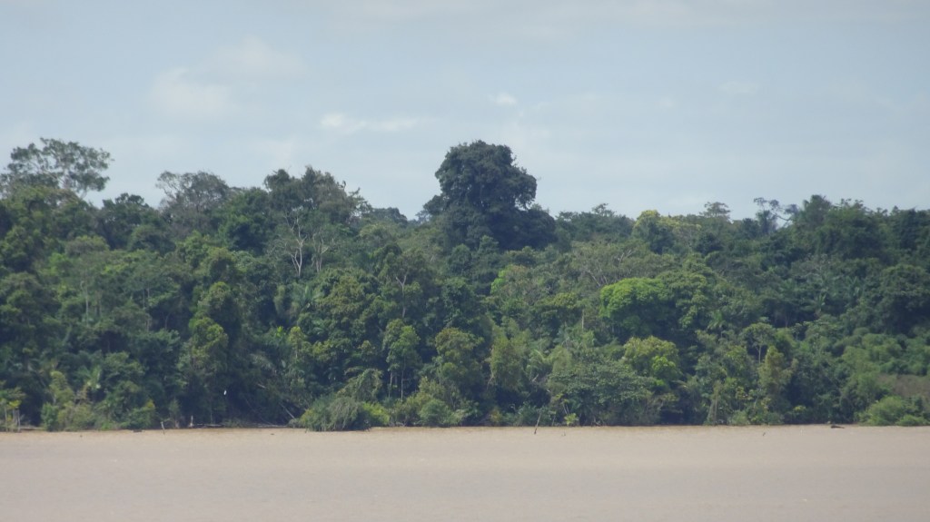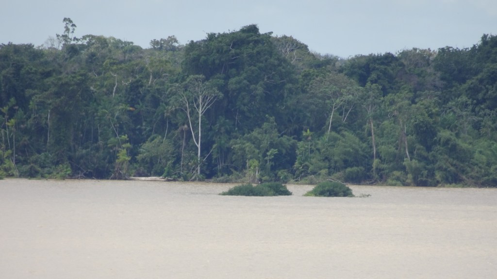 As we slowly made our way into the river (which is miles wide at this point), we passed hundreds of kilometres of shoreline showing dense rainforest—or, to be more precise, the tops of the trees of the rainforest canopy. Although the river was not extraordinarily high at that time, it was still high enough that we saw only the canopy as we glided by.