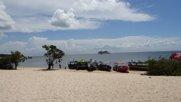 The day our ship turned left from the southern Atlantic Ocean into the Amazon River, the heavens opened up, and the rain started to fall. The rain was so intense for a while that the decks of the chip were almost ankle-deep in water. Once the rain stopped, we were left with a stultifying, leaden humidity along with the searingly hot temperatures.
