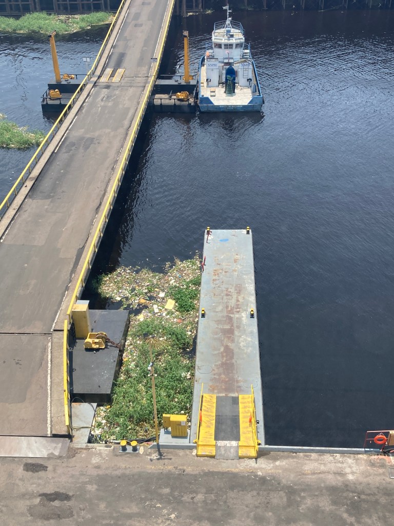 After 1500 kilometres of river cruising, we reached the port of Manaus. The port of Manaus, which is actually located on the banks of the Rio Negro near where it meets the Amazon River itself, is a vital hub in the heart of the Amazon rainforest. As the largest city in the region, Manaus acts as a gateway to the rainforest, and its port reflects the unique blend of urban life and wilderness. The first thing that stuck with us, though, was the extraordinary amount of industrial development and the massive amount of garbage that floated in the river near our dock. It was shocking.