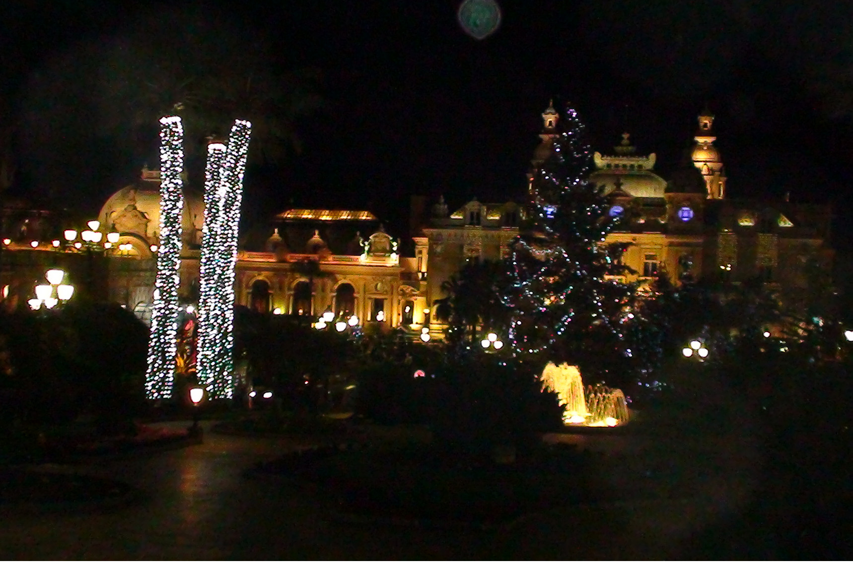 The ballet is over at 11:30, and all of us spill out into the Mediterranean night that is lit with hundreds of thousands of twinkling lights. We make our way up the hill to the casino square where side by side with the palm trees lit for the season are 50-foot high fir trees brought in and decorated so that the lights change colors. We are transported along with the crowd.